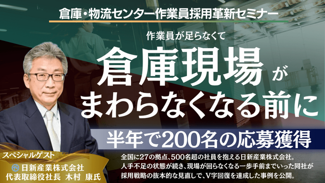 最新の倉庫・物流センター作業員の採用動向について、定量的なデータと船井総研独自のデータをもとに解説しました。また特別ゲスト講師として、日新産業株式会社 代表取締役社長 木村 康 様をお招きし、半年間で200名応募を達成した日新産業株式会社の取り組みを解説いただきました。