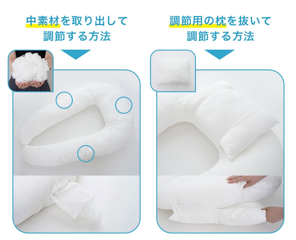 高さの調節方法は、3箇所ある高さ調節口から中素材を取り出して調節する方法と、調節用の枕を抜き差しする方法の2パターンあります。