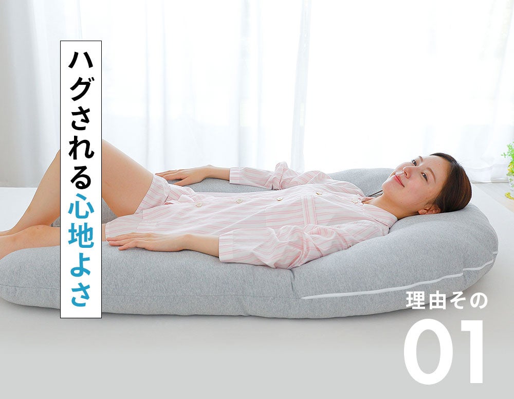 抱き枕をハグするように横向きになれば、身体を抱き枕に預けてラクな寝姿勢に。身体に抱き枕がフィットする安心感で、リラックスタイムをやさしくサポートします。