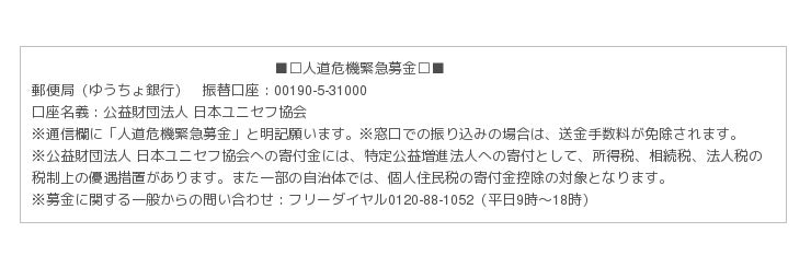 公益財団法人 日本ユニセフ協会は、先進工業国36の国と地域にあるユニセフ国内委員会のひとつで、日本国内において民間として唯一ユニセフを代表する組織として、ユニセフ活動の広報、募金活動、政策提言(アドボカシー)を担っています。 (www.unicef.or.jp)
