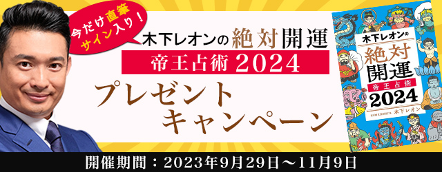 対象の鑑定をご購入された方へ、木下レオンの直筆サイン入り最新書籍「木下レオンの絶対開運 帝王占術2024」を抽選で5名様にプレゼントいたします。