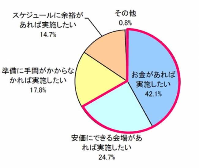 自身の結婚式を複数回実施に対して「条件があえば実施したい」と回答した人にその条件を聞いたところ、最も多く挙げられたのが「お金があれば実施したい」42.1%であり、次に「安価にできる会場があれば実施したい」24.7%と続き、金銭面の条件が大きいことが分かりました。