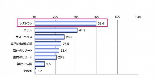 自身の結婚式を複数回実施したい層に聞いたところ、1.レストラン59.4%、2.ホテル41.2%、3.ゲストハウス28.6%となり、レストランウエディングのニーズが高いことが分かりました。レストランの場合、少人数で実施可能な場所が多く、会場費や料理費など、自身のこだわりで費用面を調整できることが影響していると考えられます。