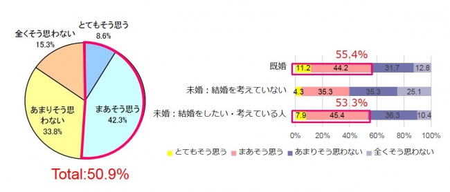 結婚式を複数回実施することについて“アリ”だと思う人は50.9%となり、未婚・既婚別では、既婚者が55.4%、未婚で結婚を考えている人では53.3%あり、結婚の経験者および関心者の過半数が賛成している。