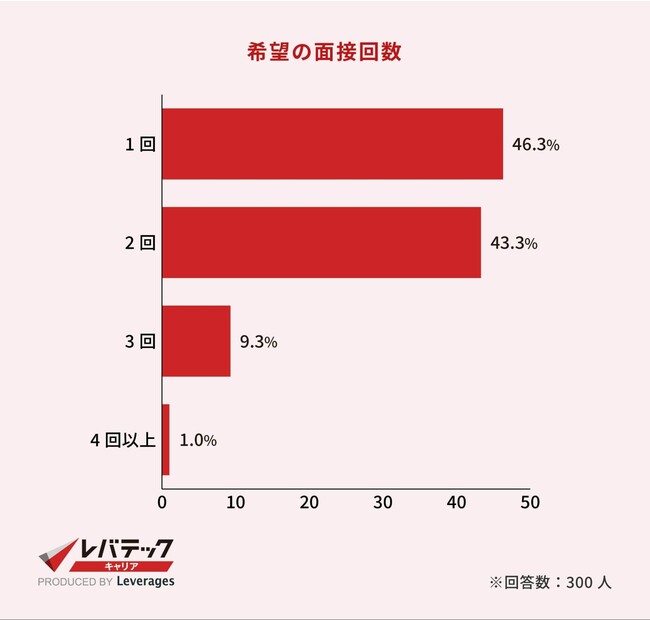 希望する面接回数として最も多かったのは「1回(46.3%)」、ついで「2回(43.3%)」となり、約9割のエンジニアが、転職活動において1回〜2回の面接を希望しています。