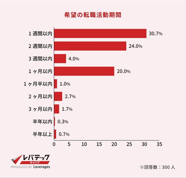 理想の転職活動期間は、「1週間以内(30.7%)」が最も多く、ついで「2週間以内(24.0%)」「1ヶ月以内(20.0%)」でした。一方で、「2ヶ月以内」の転職活動を希望するエンジニアは2.7%に留まり、転職活動をするエンジニアのほとんどが、1ヶ月以内での選考終了を希望していることが分かりました。
