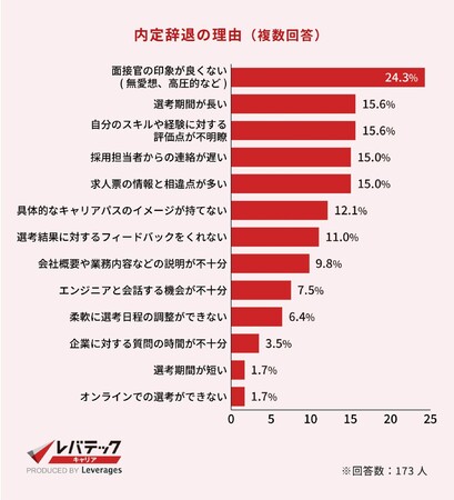 一方、内定の辞退理由では「面接官の印象が良くない(24.3%)」が最も多かったことから、選考において、面接官の印象が重要であるということが分かりました。面接の雰囲気作りや質問の仕方などを含む、面接官の教育や育成は、企業の採用強化にとって大切なポイントになりそうです。
