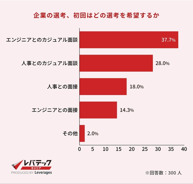 レバテック株式会社が運営するITエンジニア・クリエイター専門エージェント、レバテックキャリア( https://career.levtech.jp/ )は、社会人エンジニア300名を対象に、「ITエンジニアが魅力を感じる選考」について調査を実施いたしました。