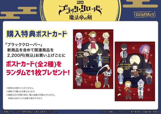 映画『ブラッククローバー 魔法帝の剣』の新グッズを含む関連商品を、1会計で2,200円(税込)以上お買い上げごとに、ポストカード(全2種)をランダムで1枚プレゼント! グッズとあわせて、ポストカードもぜひゲットしてみてください!!