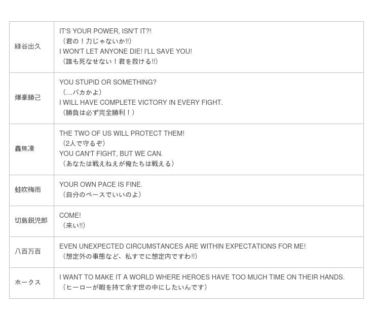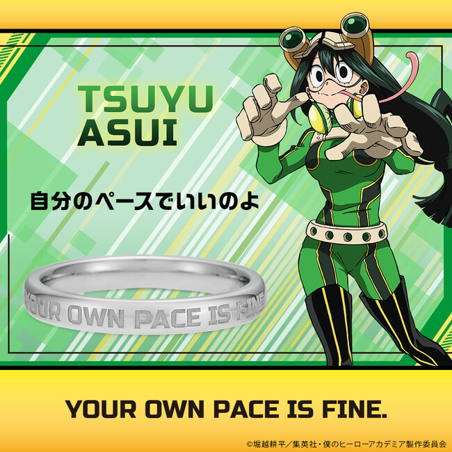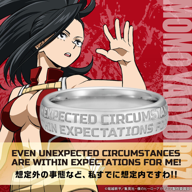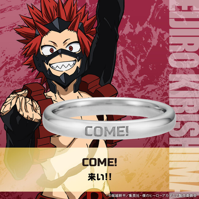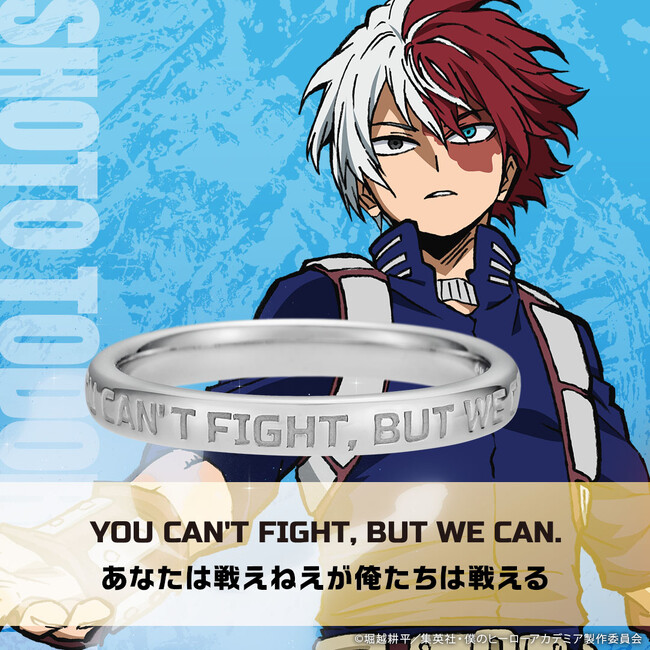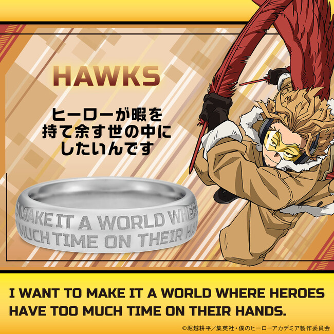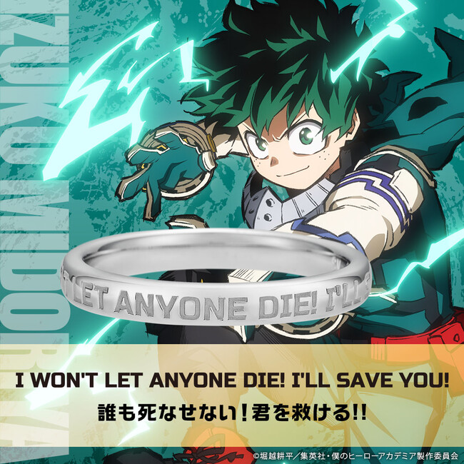 TVアニメ『僕のヒーローアカデミア』に登場する、緑谷出久、爆豪勝己、轟焦凍、蛙吹梅雨、切島鋭児郎、八百万百、ホークス、それぞれのセリフを英語版のTVアニメよりそのまま抜粋し刻印したメッセージリングです。