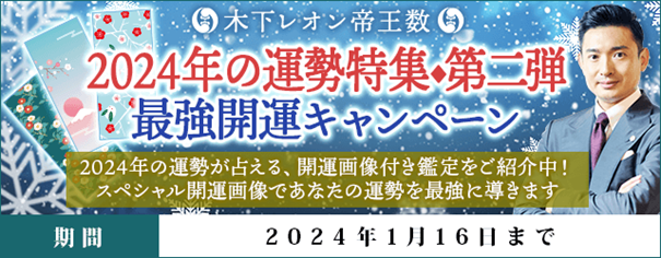 テレシスネットワーク株式会社(本社:東京都港区、代表取締役:鷹石惠充 https://www.telsys.co.jp/)は、2023年12月26日(火)より、月額公式サイト『木下レオン◆帝王数』にて、オリジナルのスペシャル開運画像がもらえる『2024年の運勢特集・第二弾 最強開運キャンペーン』を公開いたしました。