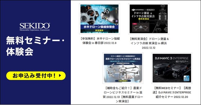 セキドでは、より多くの事業者の方にドローンを使った業務効率の改善を実現していただくため、業務用ドローンや関連ソリューションをご紹介する無料セミナーやイベントを定期的に開催しております。今後もオンラインや全国各地での開催を予定しておりますので、ご興味をお持ちのイベントにはぜひお気軽にご参加ください。