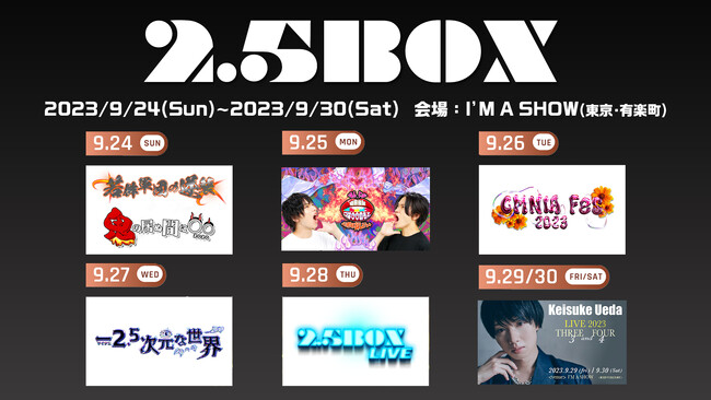 9月24日(日)から30日(土)まで、東京・有楽町 I‘M A SHOWで人気2.5次元俳優たちが贈る予測不能な1週間の祭典「2.5BOX」の一部立見追加販売を含む全8公演の一般発売、6公演での有料配信が決定した。