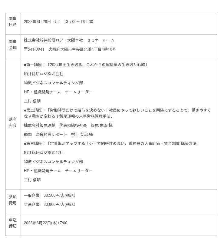 国内最大級のロジスティクス・物流コンサルティングファーム 船井総研ロジ株式会社(東京本社:東京都千代田区、代表:菅重宏、以下「船井総研ロジ」)は、2023年6月26日(月)13:00〜16:30、運送会社・物流会社の経営者を対象に「トラック運送業の社長のための乗務員の賃金制度見直しセミナー」を大阪 淀屋橋で開催いたします。