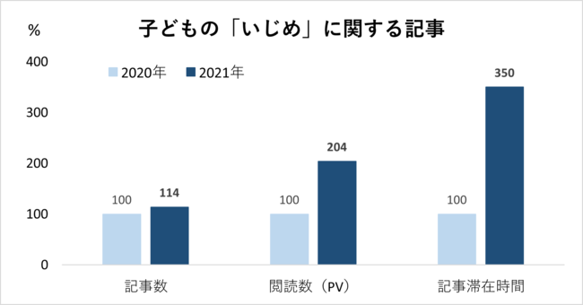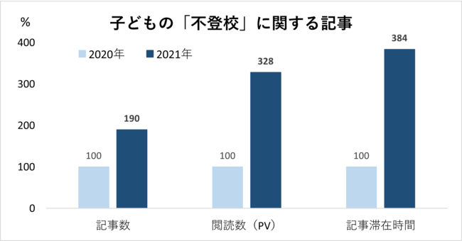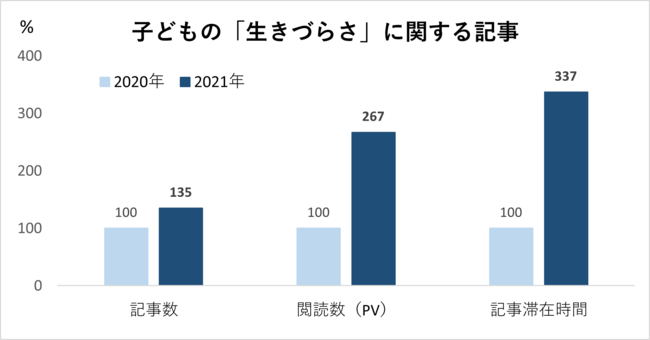 スマートニュース株式会社(東京都渋谷区、代表取締役:鈴木健)は、3,000以上のメディアから記事をお届けするニュースアプリ「SmartNews」における、2020年から2021年の掲載記事のデータとユーザーの閲読データを調査したところ(※)、子どもの「不登校」「いじめ」「生きづらさ」に関する記事について、ユーザー一人あたりの記事数、閲読数(PV)、記事滞在時間のいずれも増加していることが分かりました。メディアの関心の高まりによって記事数が増えていることに加え、ユーザーの閲読数や記事滞在時間が2倍から3倍以上と記事数以上に伸びており、子どもの生きづらさへの社会的な関心が高まっていることがうかがえます。