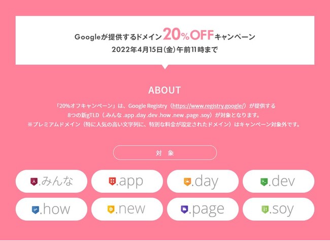 ドメイン「.moe」、「.osaka」、「.earth」の運営やオタク川柳大賞を主催する、インターネットサービスプロバイダーの株式会社インターリンク(東京都豊島区、代表取締役:横山正)は、「ドメインの日」にちなんで、Google Registry(https://www.registry.google/)が提供する新gTLD(.みんな .app .day .dev .how .new .page .soy)の20%オフキャンペーンを開催します。