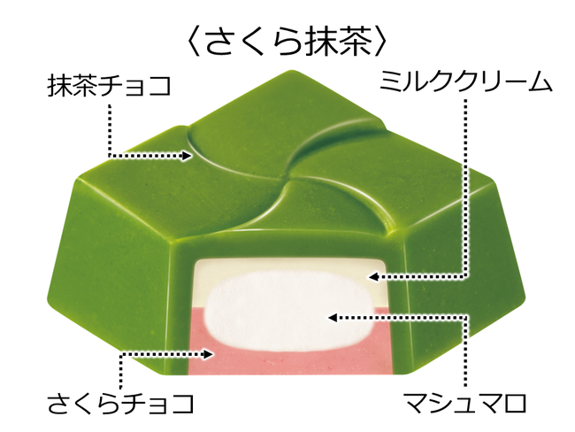 ミルククリームとマシュマロを抹茶チョコとさくらチョコで包みました。原料の抹茶には一番摘みの宇治抹茶を100%使用しており、香り高く深い味わいを楽しめます。