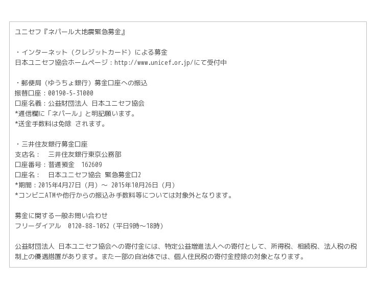 日本ユニセフ協会は、被災地で続く緊急支援ならびに今後の復興支援のための更なるご支援を受けつけています。ユニセフ『ネパール大地震緊急募金』の告知へのご協力をお願いいたします。