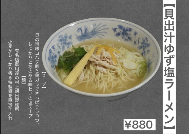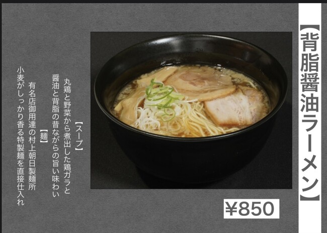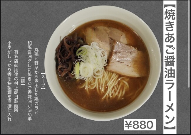 人気の焼きあご醤油ラーメンをはじめとして、背脂醤油ラーメン、貝出汁香るゆず塩ラーメンや担々麺をお出ししています。