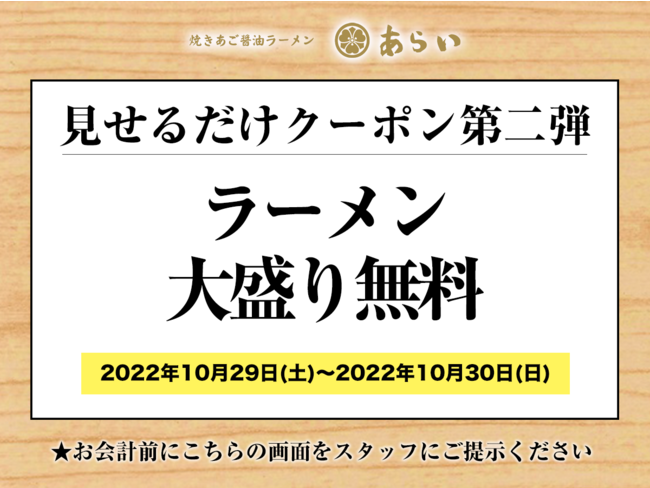 第一弾としては2022年10月29日(土)〜30日(日)の2日間限定でラーメンの大盛り無料クーポンを配布致します。(※旅行者以外の方もご利用いただけます)