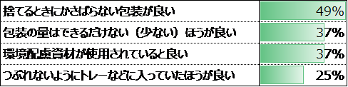 環境問題への危機意識の高まりから、環境配慮資材が使用されている事、またごみを捨てる際にかさばらない、量の少ない包装を志向する傾向が伺えます。