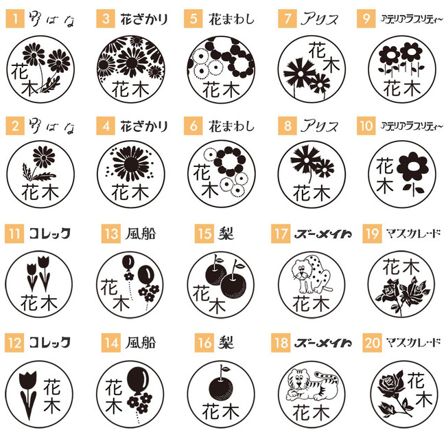 イラストはこちらの20種類。デザイン性に定評のあるアデリアレトロの中でもとくに人気の高い「野ばな」や「花ざかり」「アリス」「コレック」「ズーメイト」といった10のテーマから好きなデザインを選ぶことができます。