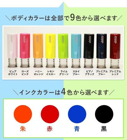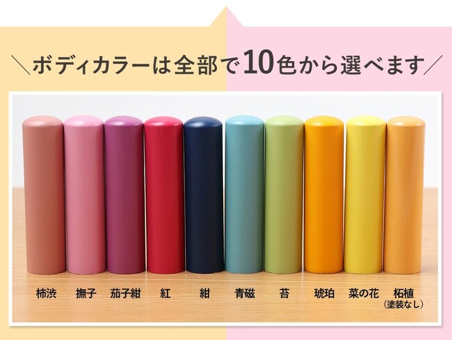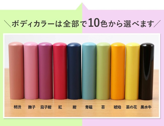 はんこのタイプはこちらの3種類。荷物の受け取りやサイン代わり、お子さまの連絡帳などに使えるセルフインクタイプは9色のボディーカラー、4色のインクカラーより選べます。銀行登録にも使える木彫り・水牛タイプはそれぞれ、「青磁」や「琥珀」といった日本の伝統色を表現した10色より選べます。すべて選んだ印面と同じデザインが楽しめるかわいい筒型ケースが付属します。