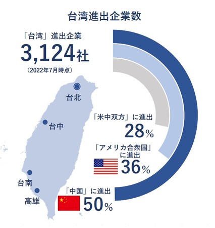 台湾進出企業の特徴の一つとして、中国への進出割合も高い点があげられる。台湾進出企業3124社のうち、中国に進出している企業は50%を占め、台湾企業が結びつきを強めるアメリカ合衆国(米国、36%)と比べても高い