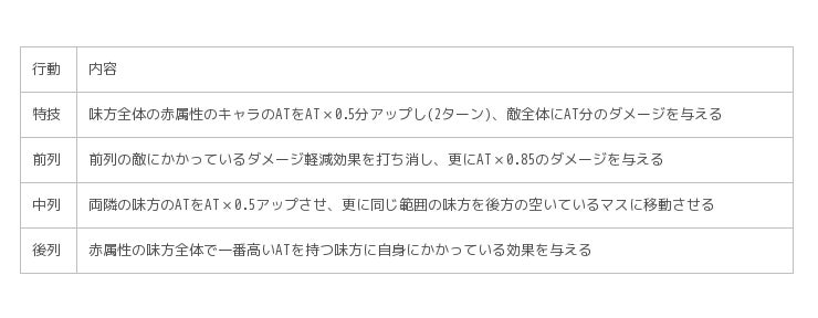 「神速」からの中列行動で広範囲にステータス変化無効をかけることができ、敵の策略を大幅に妨害することが可能です。また、前列行動は広範囲に威力の高いバースト効果を付与し、敵のAGを減少させるカードと組み合わせることによって驚異的な火力を生み出せます。強力な能力「威神」を有しているので、特技ゲージを減少させるカードと組み合わせて、1ターン目から特技の発動を狙うのも有効な戦略でしょう