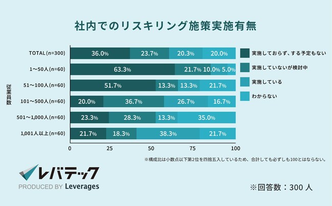 ITスキルを社員へリスキリングする必要性を感じている管理職の割合は60.3%となりました。特に従業員数が101名以上の企業で6割を超える結果となり、より必要とされていることがわかりました。