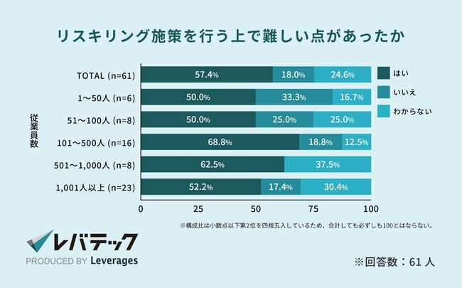 「リスキリング施策を実施する上で難しいと感じた点があった」と回答した人の割合は、57.4%に上りました。