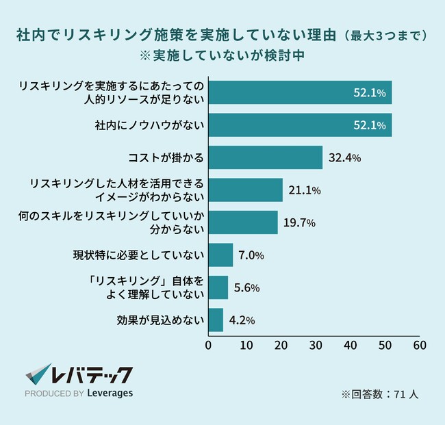 リスキリング施策を「実施しておらず、する予定も無い」と答えた理由として最も多かったのは「現状特に必要としていない(40.7%)」となりました。「実施していないが検討中」と答えた理由には、「リスキリングを実施するにあたっての人的リソースが足りない(52.1%)」「社内にノウハウがない(52.1%)」があげられています。
