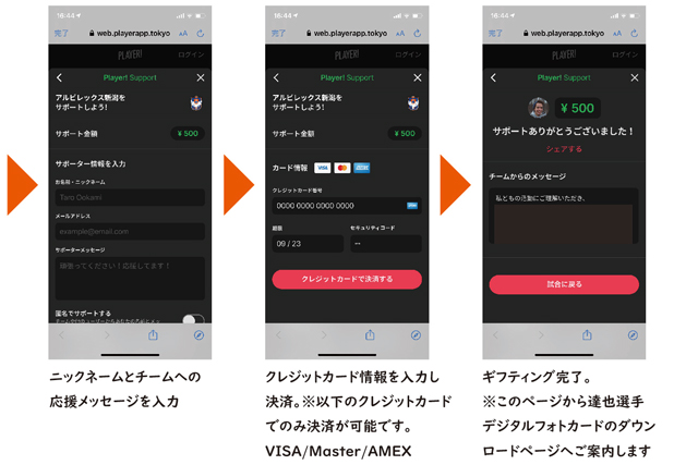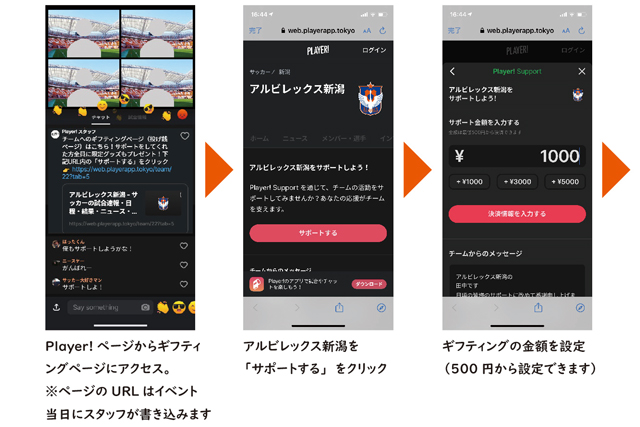 ギフティングによりクラブを応援することができます。配信中にコメント欄に表示されるURLからギフティングのページに移動し、金額を決定のうえ、クレジットカード情報を入力することで、ギフティングができます。その際、応援クラブは「アルビレックス新潟」をご選択ください。