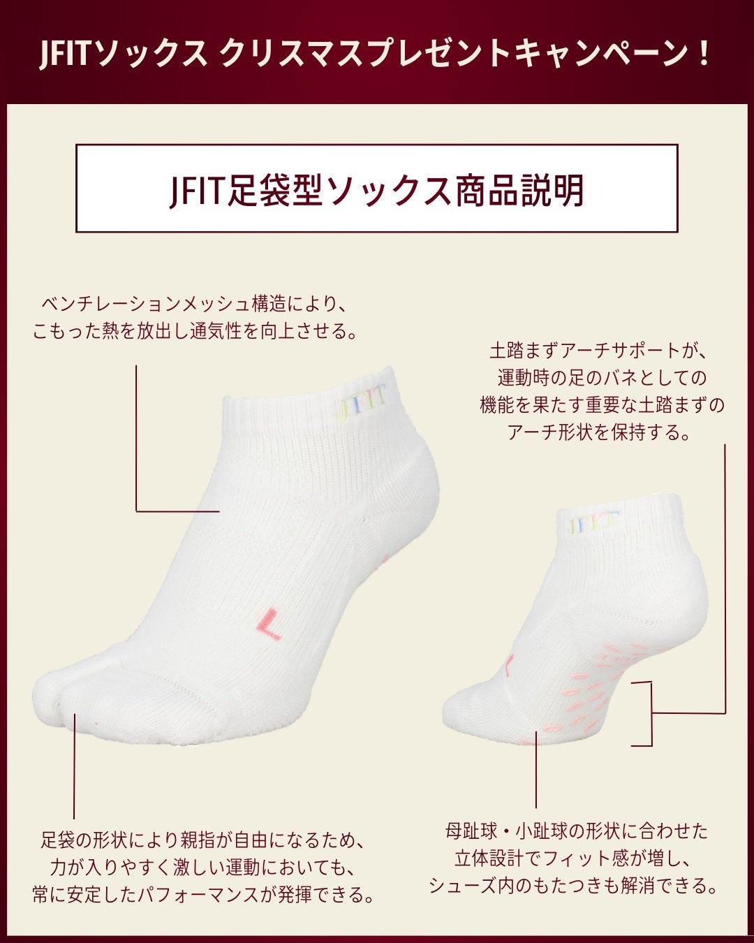 ゼット株式会社(本社/大阪市天王寺区、代表取締役社長/渡辺裕之)のオリジナルブランド『JFIT(ジェイフィット)』の公式インスタグラムアカウント(https://www.instagram.com/jfit_jp/)にて、2025年11月28日(金)〜12月15日(月)の期間中、人気の足袋型ソックス【JF-SOX8】(8cm丈)が抽選で当たるクリスマスキャンペーンを開催中です。
