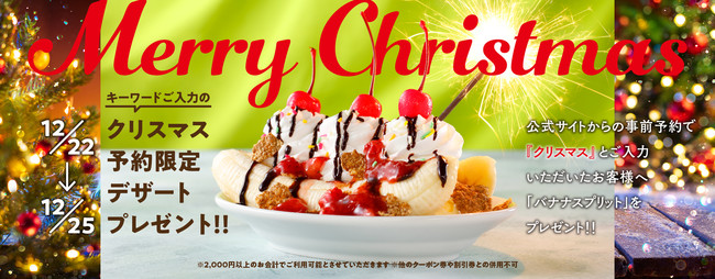 「焼肉の和民」公式ホームページから期間中の事前予約が対象で、ご予約時に「クリスマス」とキーワードをご入力いただいたお客様限定で、ご来店時にデザートの「バナナスプリット」をプレゼントいたします。