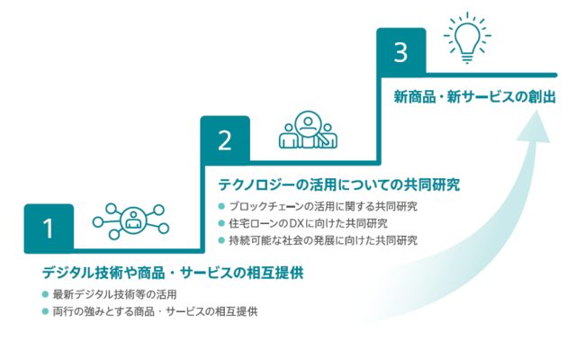 不動産ローン債権のセキュリティ・トークン化をはじめとするブロックチェーンの活用について、両行でユースケースの共同研究を行い、金融・非金融両分野でのサービス提供に向けた検討を行っていきます。