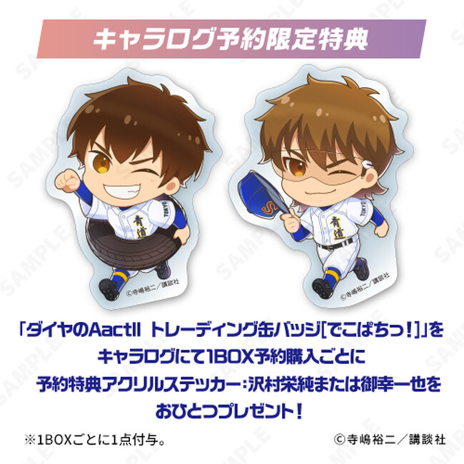 ◆「キャラログ」にて、「ダイヤのA actII トレーディング缶バッジ [でこぱちっ!]」を1BOXご予約ごとに、「予約特典缶バッジ(全2種)」をどちらかおひとつプレゼント!(※選択可)