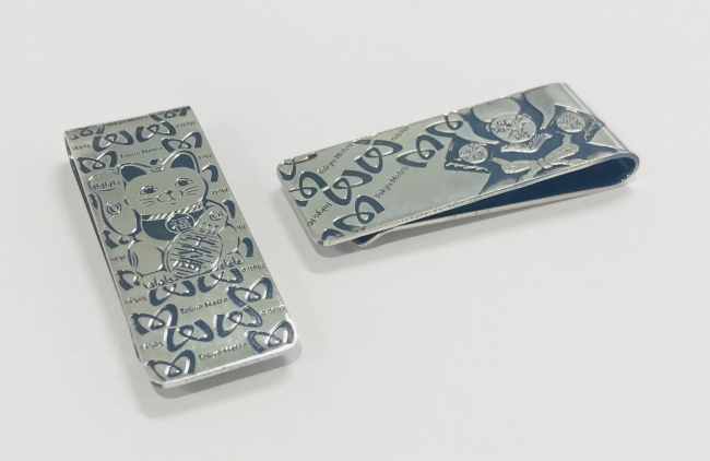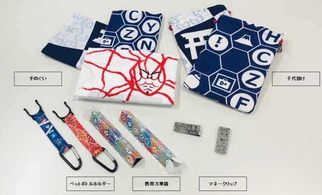 販売するオリジナルグッズは「手ぬぐい」「マネークリップ」「ペットボトルホルダー」「携帯万華鏡」「千代掛け」の5種類となります。なお、今回のオリジナルグッズは日本人のお客様もお買い求めいただけます。