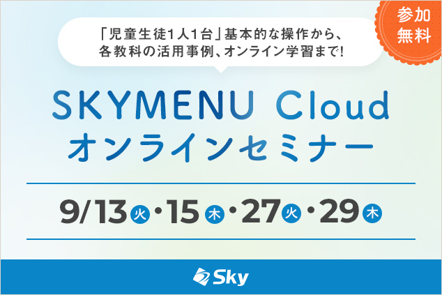 Sky株式会社では、教育委員会、自治体、学校の職員、教員の方を対象に、児童生徒1人1台の学習活動端末支援Webシステム「SKYMENU Cloud」の基本的な使い方や教科指導、オンライン学習における活用例のご紹介など、毎月複数のテーマを設けてオンラインセミナーを開催しています。
