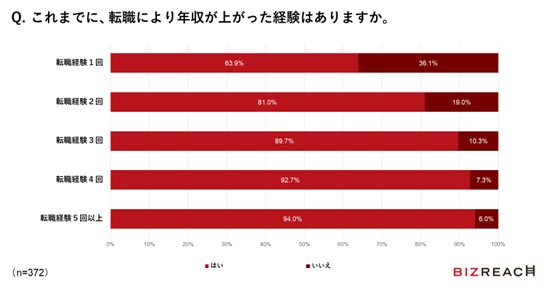 また、転職により年収が上がった経験があるか聞いたところ、転職回数が1回のビジネスパーソンは、「ある」の割合が63.9%だったのに対し、転職回数が2回の場合は81.0%、3回の場合は89.7%と複数回転職を経験しているビジネスパーソンのほうが高い傾向が見られました。