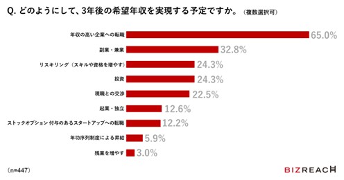 希望年収を実現するための方法は「年収の高い企業への転職(65.0%)」「副業・兼業(32.8%)」「リスキリング(24.3%)」が上位に
