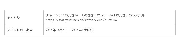 DVDでは、小学生に扮したおかずクラブが小学1年生と一緒に「生活習慣も勉強もバッチリの1年生になる」といった決意を子どもたちがマネしやすいダンスとしてお届けし、1年生になることを楽しみにしてもらうとともに、保護者のかたが入学までに出来るようになってほしいテーマを紹介しています。さらに子どもたちの入学準備を盛り上げるため、DVDの一部をCMとして10月29日より全国放映を行います。