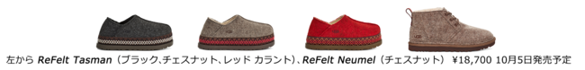 今秋発売予定のサステナビリティ・カプセルに引き続き、バージン素材への依存を減らすためにデザインされたReFelt Tasman(リフェルト タスマン)とReFelt Nuemel(リフェルト ニューメル)は、プラスチック廃棄物をリサイクルして作られたリサイクルポリエステル繊維フェルト100%のアッパーを使用したクラシックファッションのUGG(R)スタイルです。それぞれのスタイルは、責任を持って伐採された木から採取されたTENCEL™ リヨセルを使用したふわふわのライニングと、石油由来のエチレンの代わりに再生可能なサトウキビ由来の素材を使用したSugarSole™アウトソールが特徴です。
