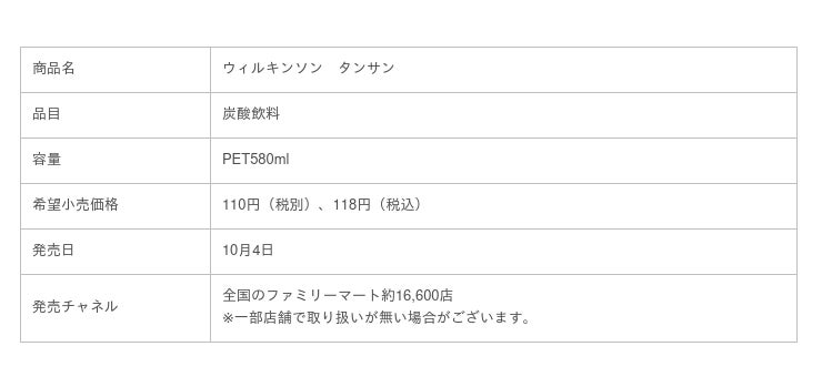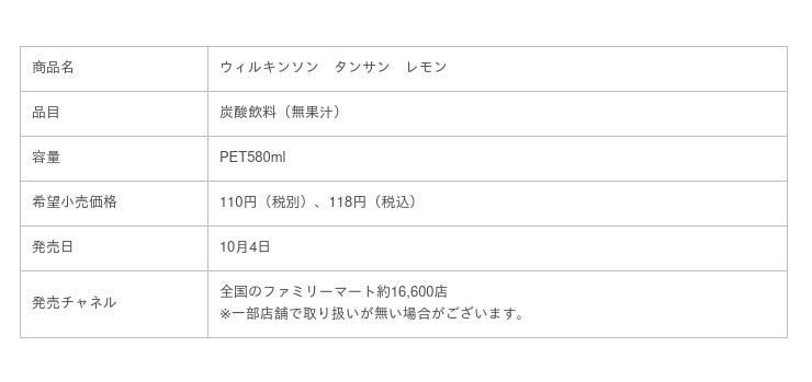アサヒ飲料株式会社(本社 東京、社長 米女太一)は『ウィルキンソン タンサン』『ウィルキンソン タンサン レモン』PET580mlを10月4日から全国のファミリーマート限定で発売します。