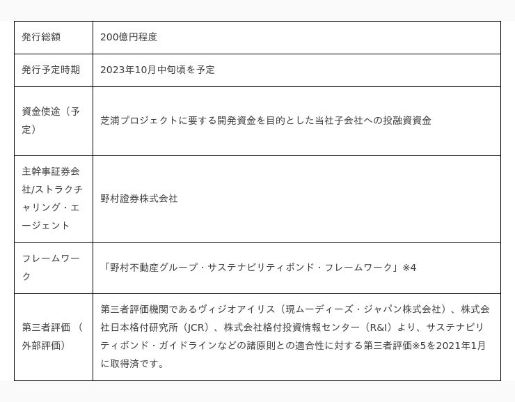 野村不動産ホールディングス株式会社(本社:東京都新宿区/代表取締役社長:新井 聡)は、東日本旅客鉄道株式会社(本社:東京都渋谷区/代表取締役社長:深澤 祐二)と共同で推進している国家戦略特別区域の特定事業である、「芝浦プロジェクト」(以下「本プロジェクト」)を資金使途とするグリーンボンド(別称:野村不動産ホールディングス 芝浦グリーンボンド)を10月中旬頃に発行(以下「本発行」)予定であり、本日2023 年9月26日に、本発行に向け社債の訂正発行登録書を関東財務局に提出いたしましたので、お知らせいたします。