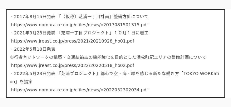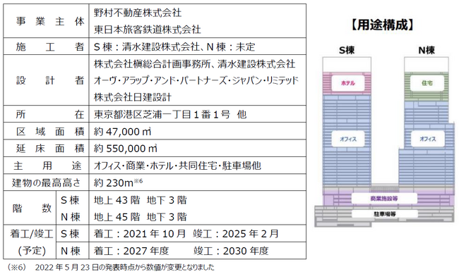 本プロジェクトは、浜松町ビルディング(東芝ビルディング:東京都港区芝浦1-1-1)の建替事業として、2021年10月に着工したS棟と、2027年度着工予定のN棟からなるツインタワーの建設を計画しております(竣工予定時期:S棟2025年2月、全体2030年度)。区域面積約4.7ha、延床面積約55万平方メートル の、オフィス・ホテル・商業施設・住宅等を含む、約10年間に及ぶ大規模複合再開発です。東京ベイエリアの新たなシンボルとして、国際ビジネス・観光拠点を創出します。本プロジェクトでは、街づくりを通じて、人も社会も、現在も未来も、継続して健やかで幸せであることを目指します。芝浦エリアの空と海が広がる環境を活かすことで、人々の新たな時間の過ごし方を実現し、サステナブルな社会を未来に届けていきます。