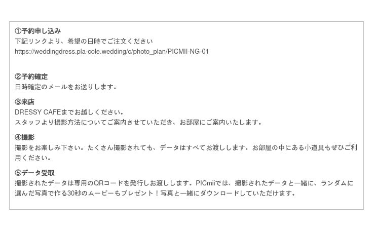 PICmiiは、カメラ専門店「カメラのキタムラ」および写真スタジオ「スタジオマリオ」で培ったノウハウを活かし、撮影画質の仕上がりにこだわったセルフ写真館で、個室での自由な撮影をお楽しみいただけます。新設されるDRESSY CAFEスタジオは、ドレス&アクセサリーショップ、フィッティングルームを併設し、気軽にウェディングフォトを撮影できる特別なスタジオです。PLACOLE&DRESSYオリジナルデザインのドレスや、人気ブランドとのコラボドレスが着用でき、ウェディングドレスをもっと身近に、もっと気軽に、体感できる空間となっております。DRESSY ONLINEにてご予約受付を開始しております。