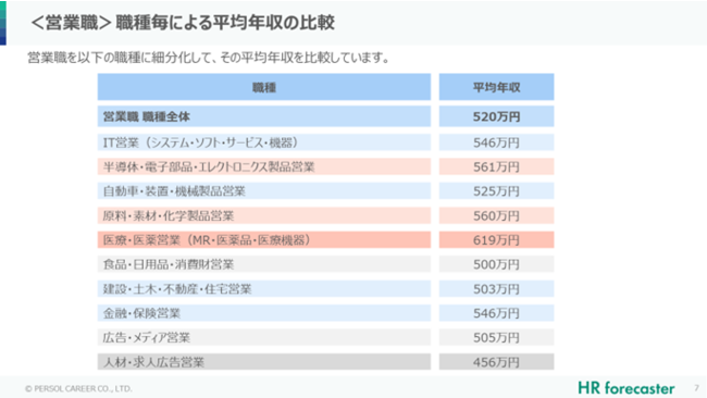1.【職種別平均年収】トップは、医療・医療営業(MR・医薬品・医療機器)で619万円