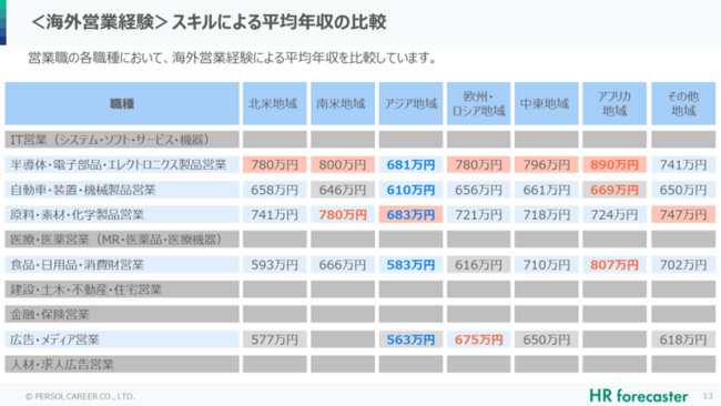 平均年収が1番高い組み合わせは、アフリカ地域での海外営業×半導体・電子関連営業で890万円