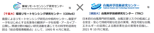 千葉大学の「環境リモートセンシング研究センター(CEReS)」「災害治療学研究所」「大学院園芸学研究院」と横浜国立大学の「台風科学技術研究センター(TRC)」「大学院環境情報研究院」「大学院都市イノベーション研究院」などの特色や機能を活かして、台風などの災害リスク低減や、地球環境・生態の保全に向けて横断的に連携し、脱炭素社会実現への貢献を目指します。